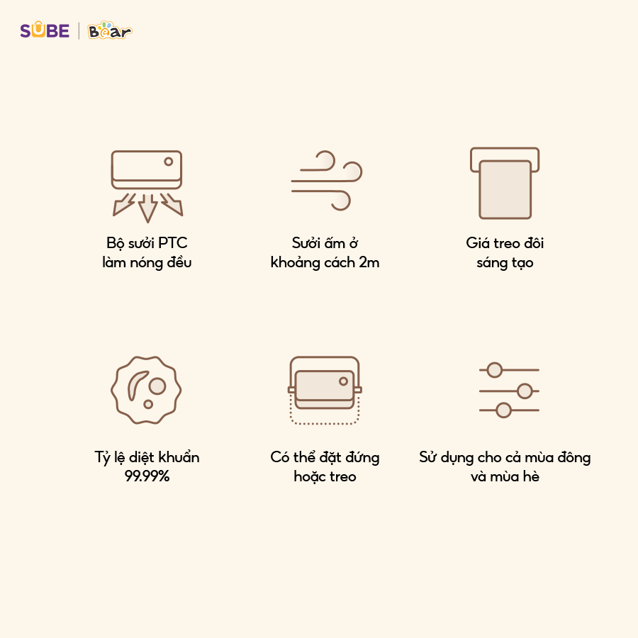 - Tỷ lệ diệt khuẩn của máy sưởi Bear đến 99.99% theo Báo cáo chứng nhận từ Trung tâm Kiểm nghiệm Sinh học Quảng Đông.